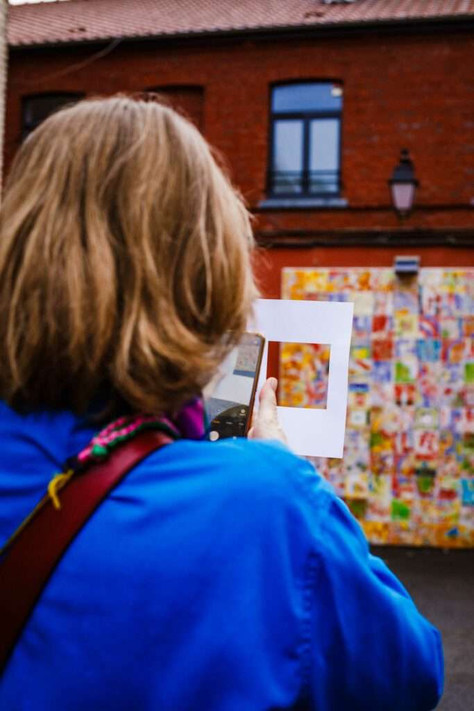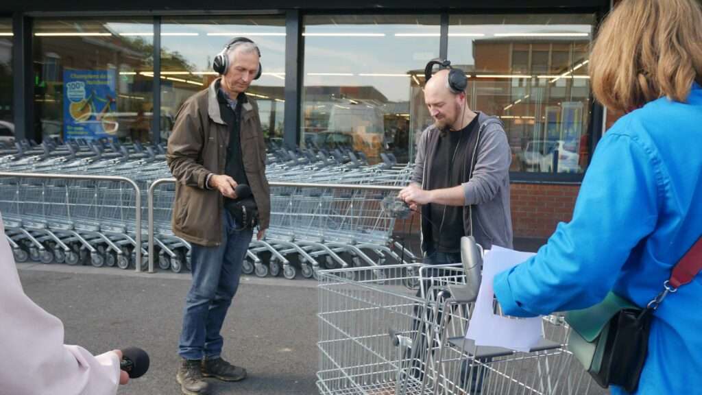 A la manière de promenades exploratoires, les personnes sont invitées à regarder et écouter leur quartier sous un angle nouveau. Le sensoriel guide la vision : un bruit de pas sur les feuilles sèches, le claquement des caddies sur le parking d’un supermarché… chaque bruit est scruté pour créer une matière sonore qui est ensuite exploitée lors d’ateliers musicaux.